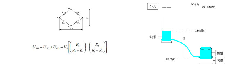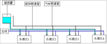 工作原理:各沉降監(jiān)測點安裝壓阻式靜力水準(zhǔn)儀,并需要在一相對不動點安裝基準(zhǔn)罐。傳感器之間通過高強度的氣壓管聯(lián)接一起匯入到基準(zhǔn)罐,每個水準(zhǔn)儀內(nèi)部都安裝有高精硅壓傳感器,在基準(zhǔn)罐與傳感器之間充滿液體介質(zhì),水準(zhǔn)儀內(nèi)的壓力傳感器感測到的是該點到基準(zhǔn)罐液體表面的壓力,該壓力與液面高度有一定線性關(guān)系。如果壓力傳感器感測到壓力發(fā)生變化即說明該點與基準(zhǔn)液面之間的高差發(fā)生變化,根據(jù)出廠前的壓力變化量與液面高差的標(biāo)定線性表,靜力水準(zhǔn)儀內(nèi)部的單片機可以計算出高差變化值。根H=P/ρ*g計算出從測點到基準(zhǔn)點液面到傳感器高度。原理示意圖如下: